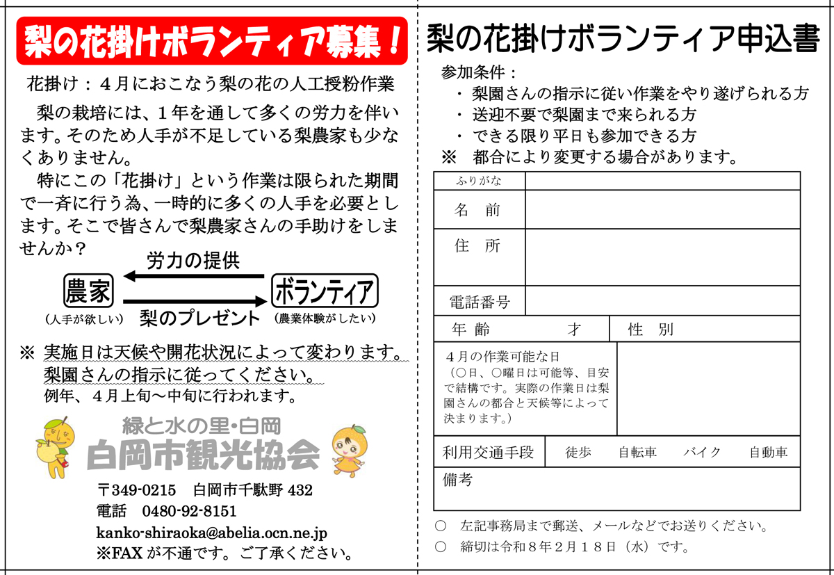 令和8年春の梨の花掛けボランティアの申込書はこちら