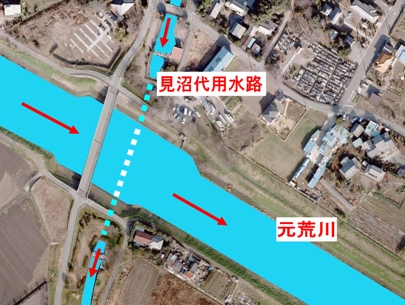 元荒川と見沼代用水の交差地点で、元荒川の川底を見沼代用水が抜け出る構造になっています。これは、流体を低い所に落とし、元の高さまで押し上げる連通管の理論を応用したものです。この伏越は、享保12年(1727)に井沢弥惣兵衛為永によって「紀州流」という土木技術でおこなわれました。当初、伏越地点では伏越と掛渡井(元荒川の上を樋によって通水する)がおこなわれ、舟運にも利用されていました。